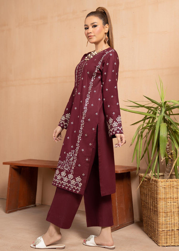 This summer, enjoy the beauty of this deep burgundy colour, with prodigious design and intricate embroidery details to perfectly accentuate your wardrobe. The immaculate embroidery is a combination of both ivory and the same colour thread looks rich and soothing. This 2 pc set will make you stand out from the crowd.