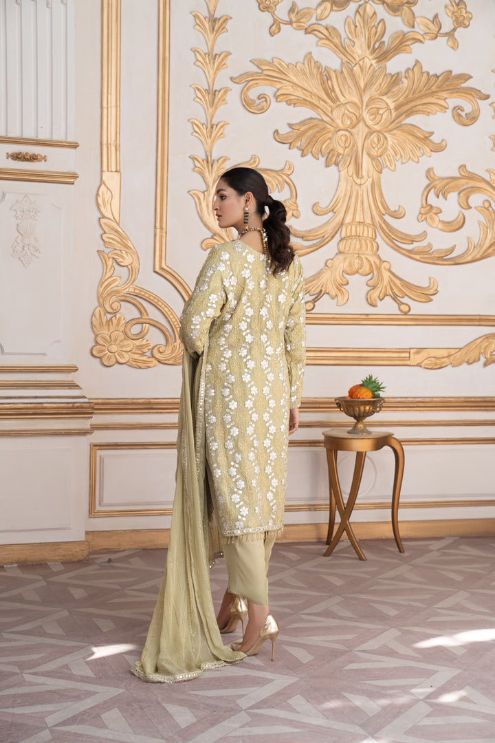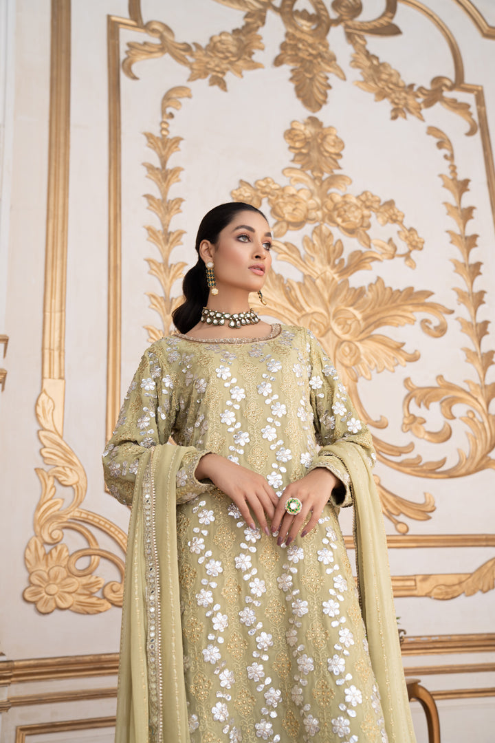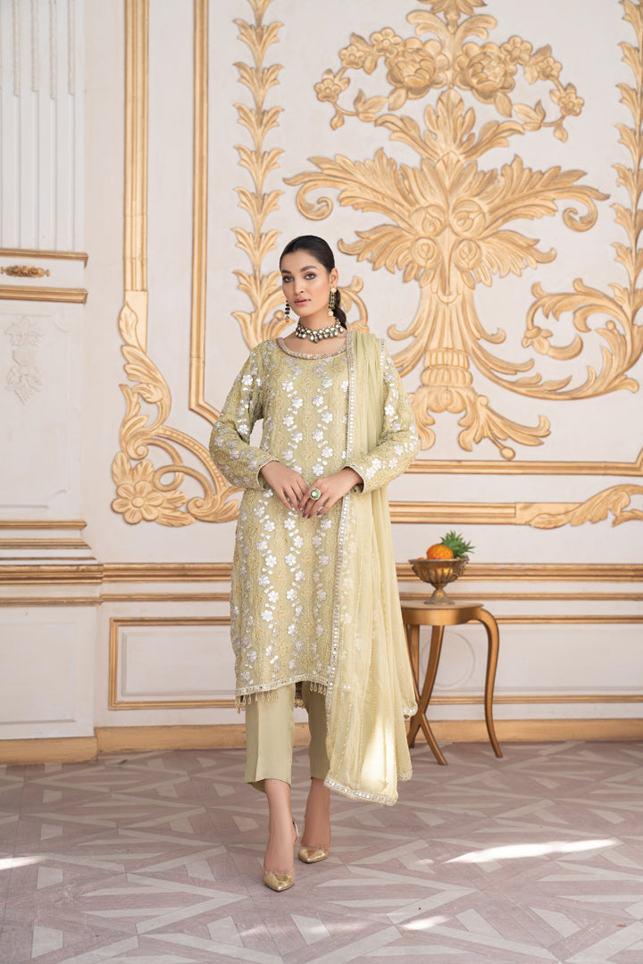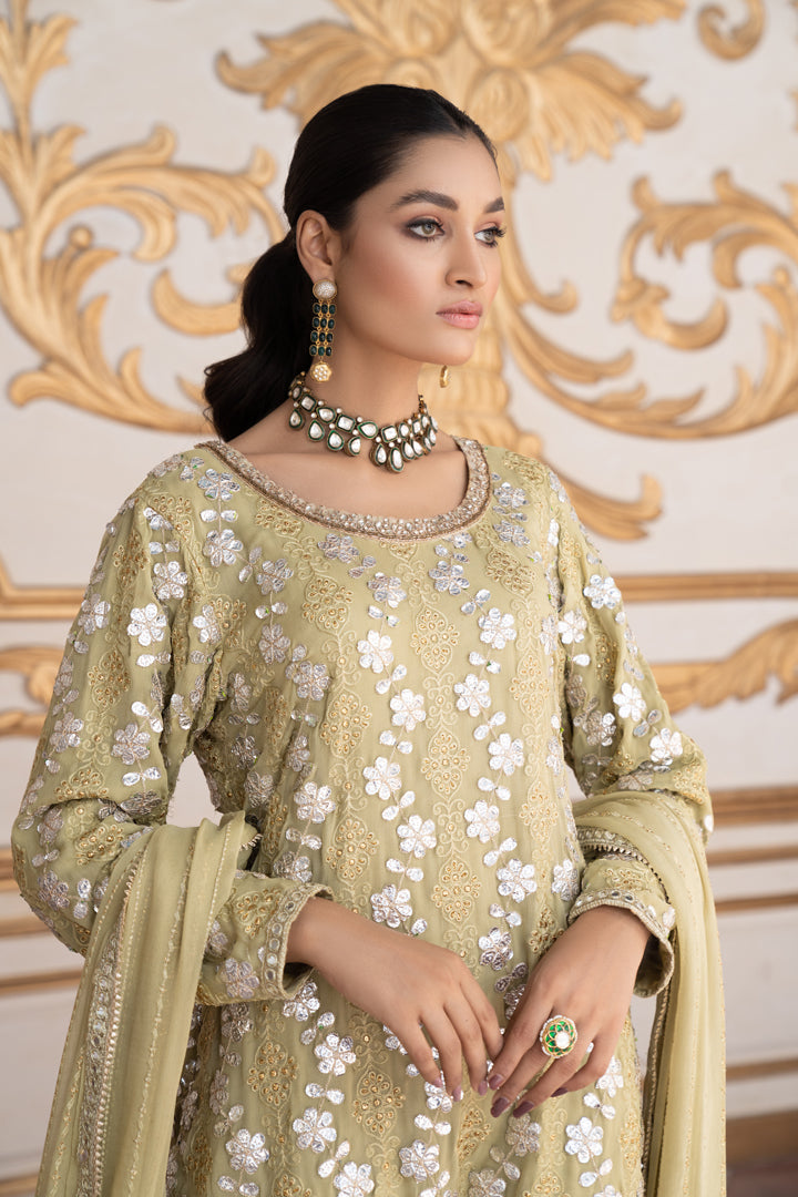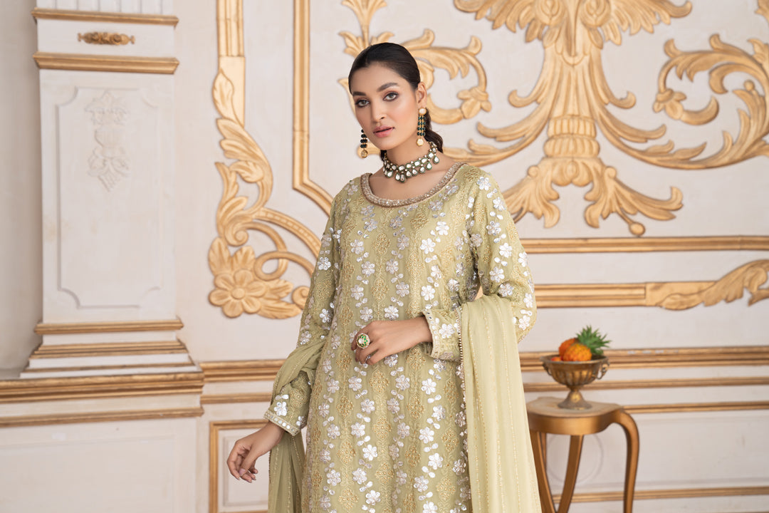 All outfits are made on delicate chiffon fabric adorned with dazzling pani work and eye catching sequins, as well as intricate embroidery and gold tilla, having handwork on the neckline which appeals to the senses. The dupattas framed with beautiful detailing.