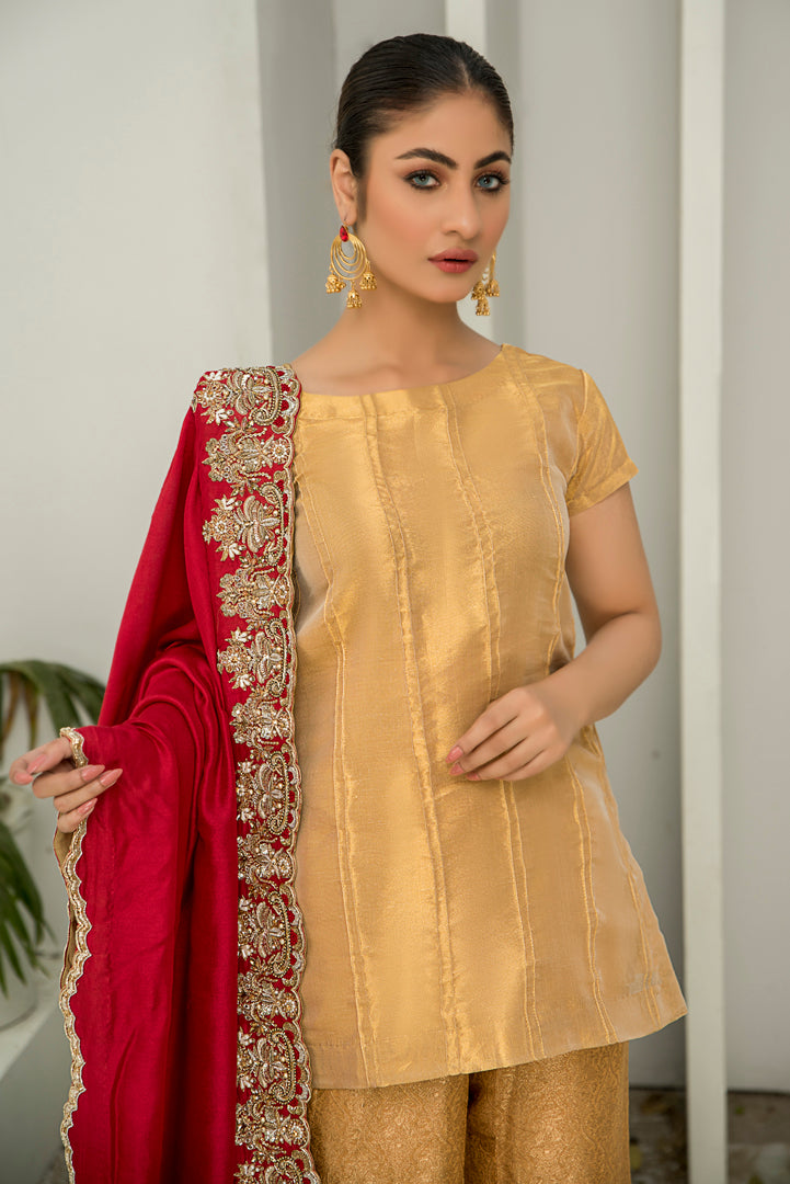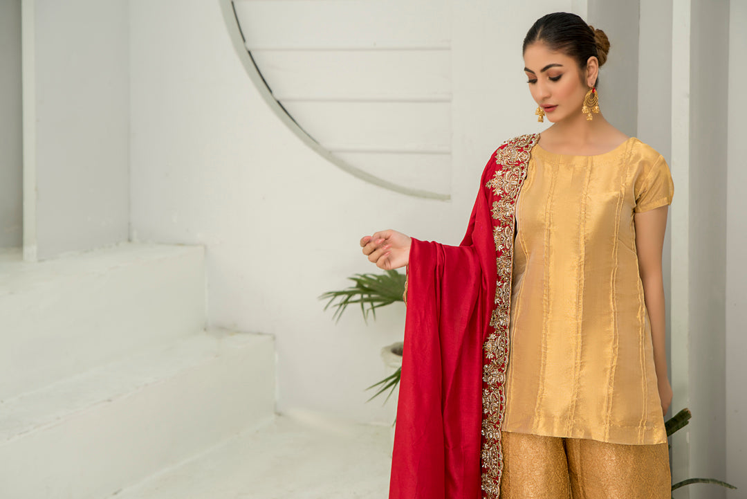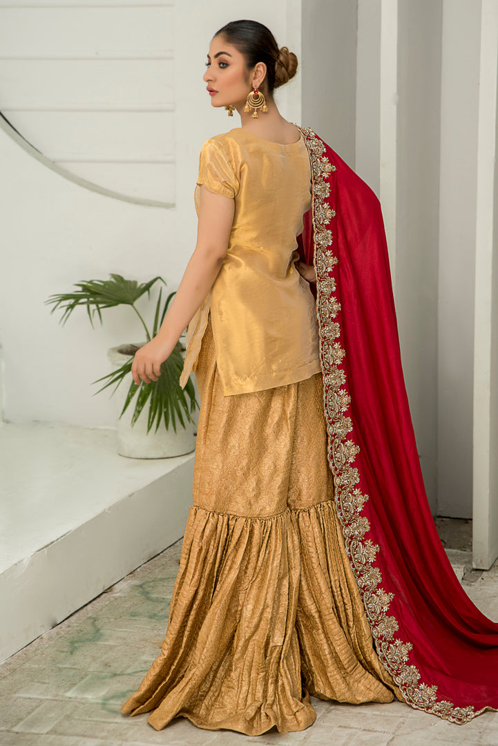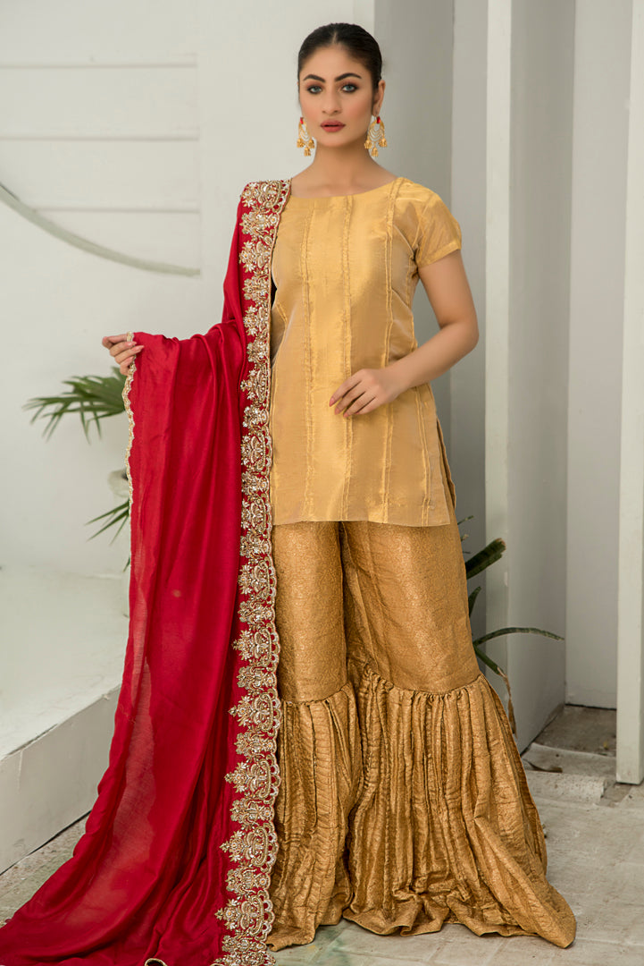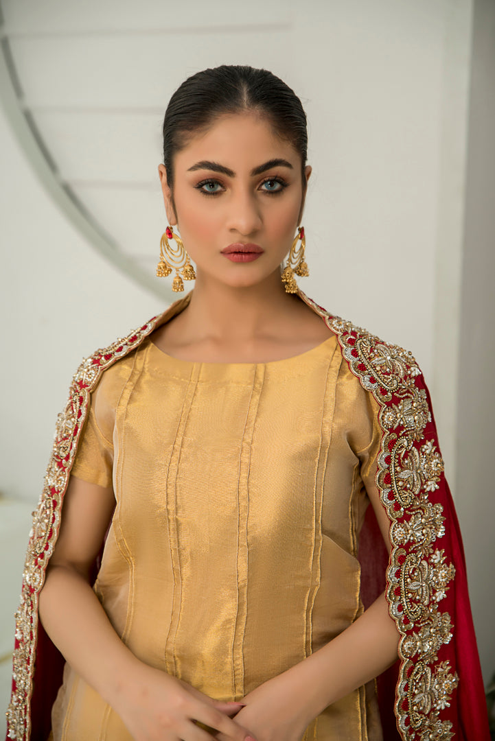 A bright golden organza pleated shirt paired with a crushed gharara. The set is paired with a completely hand embroidered blood red cotton net dupatta having more than ten types of material to give it a rich look.