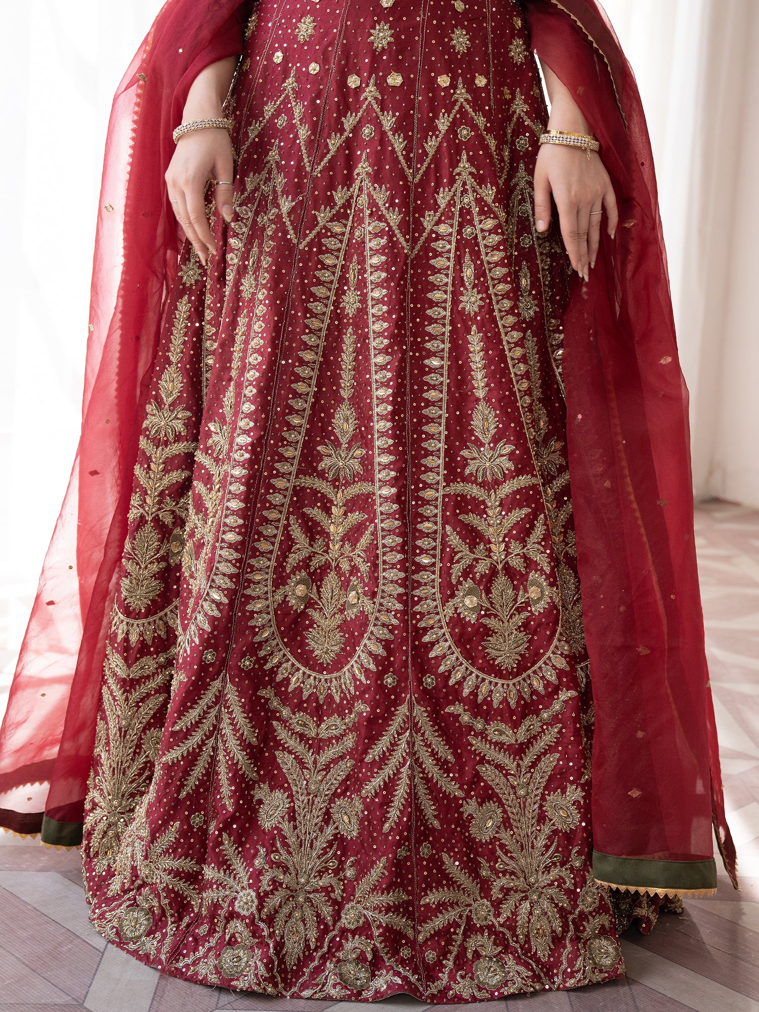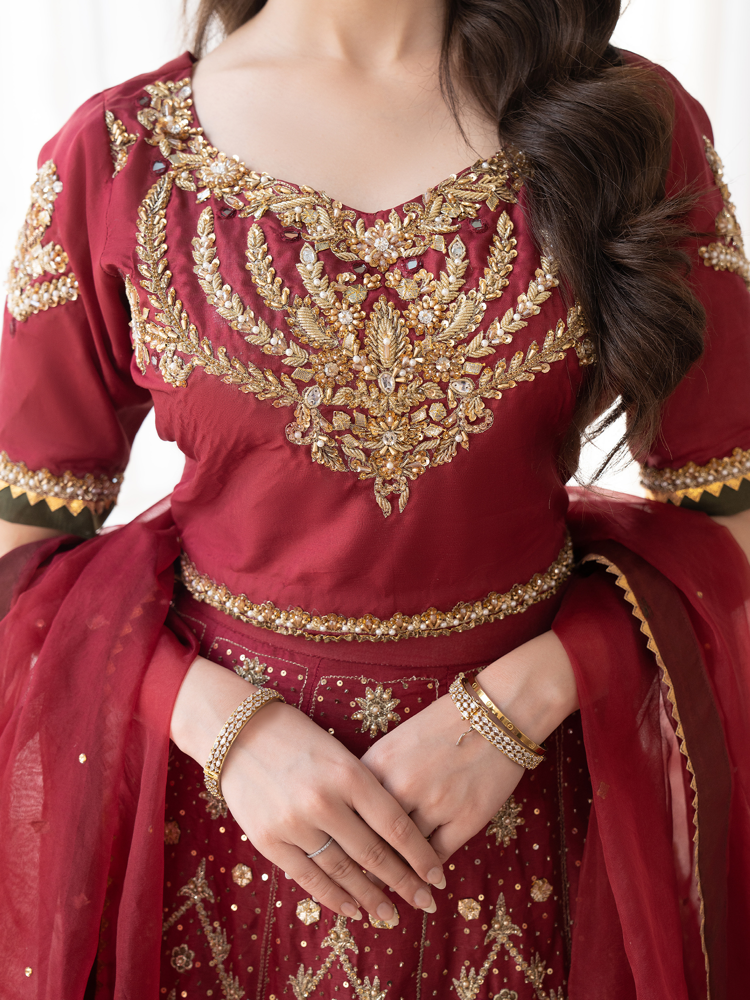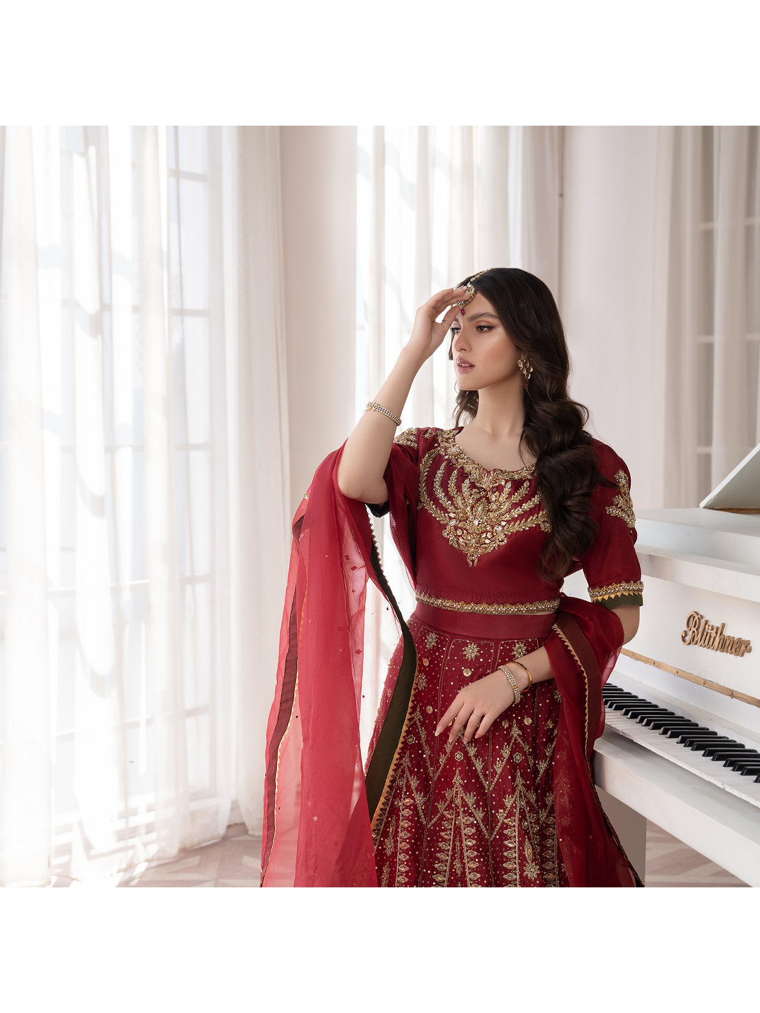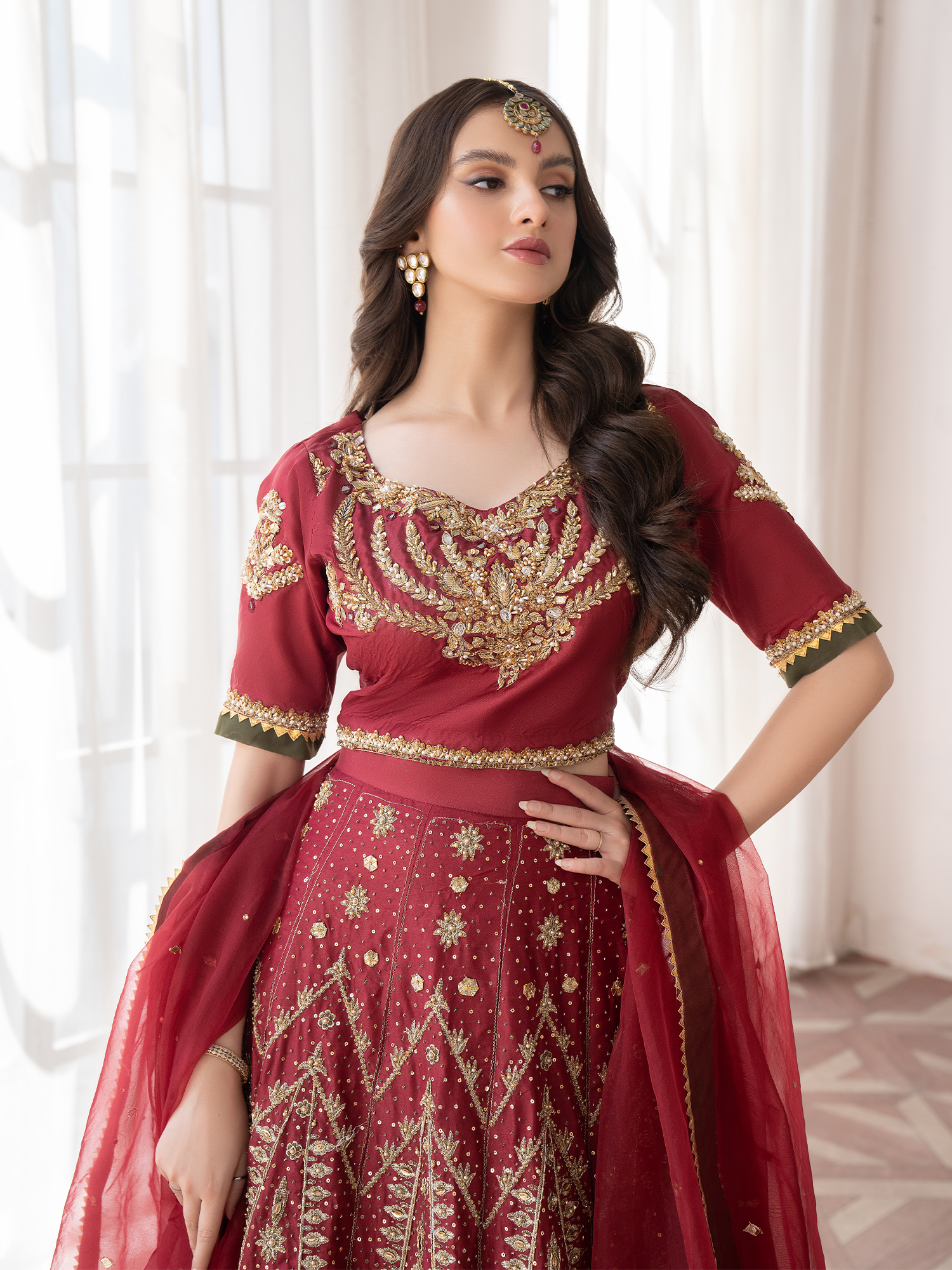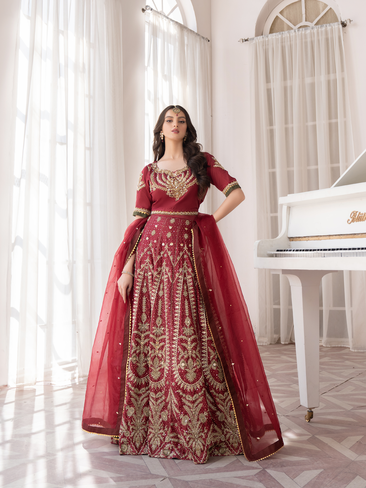 A meticulously embellished kurti with finest detailing, paired with a heavily embroidered & handworked lehanga. Finished off with an organza chann duppata framed with gotta patti & mehndi green edgings.