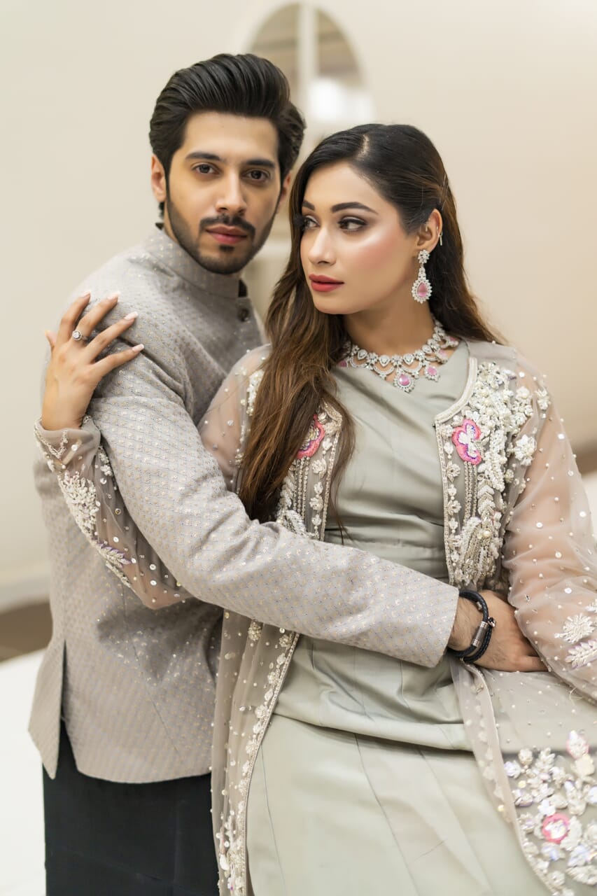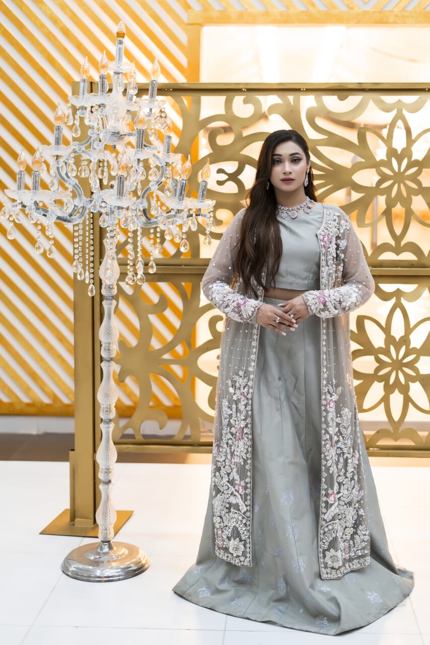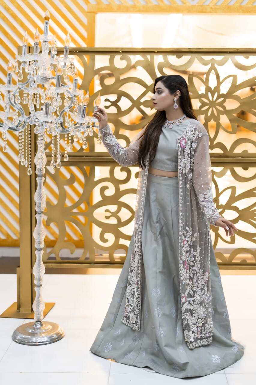 A solid grey lehenga choli with a grey net gown adorned with vibrant splashes of pink and white embellishments done by hand. The borders are laced with intricate crystal sequences and delicate crystal motifs dusted all over.
