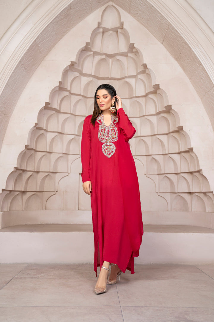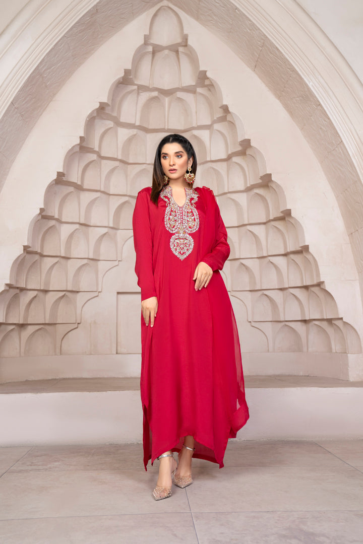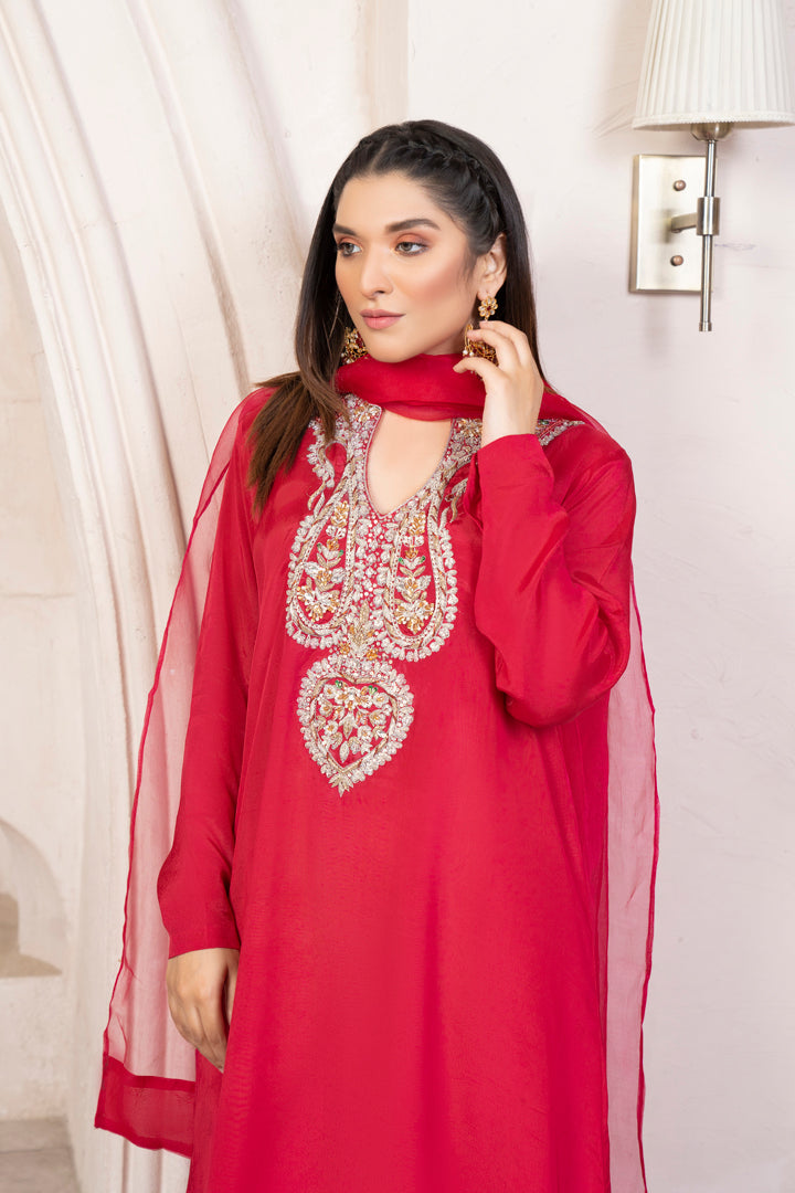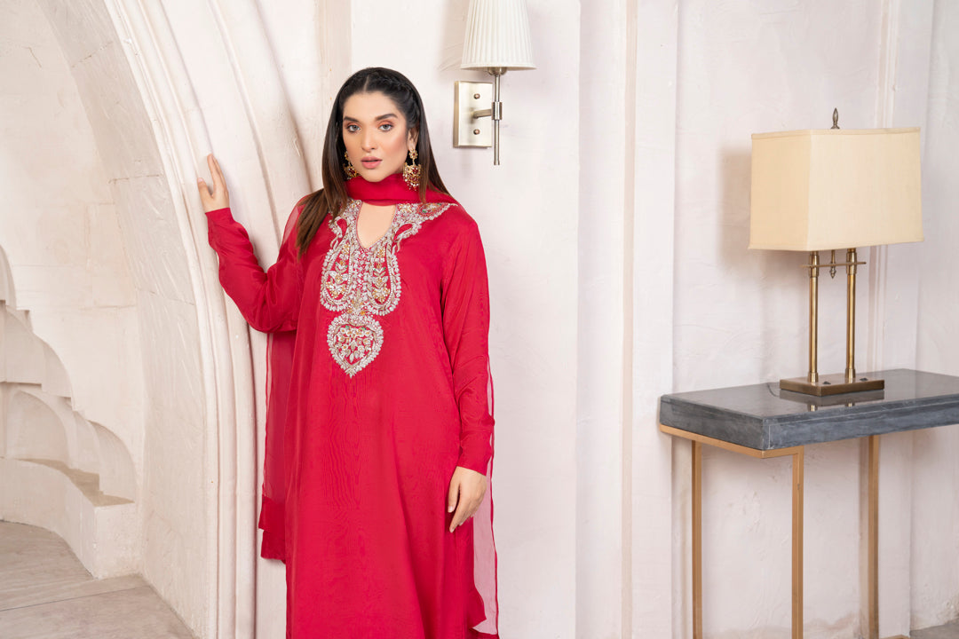 Dream” from our luxury edit poise is fresh red color with all handwork on the keyhole neckline featuring glamorous embellishments of zardozi , naqshi, tilla & cut dana.