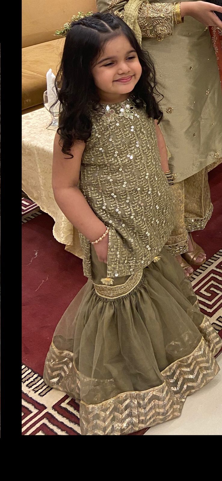 Sequece embroidered net kirti with mirror work detailing and tassels at the hem, paired with full flared gharara dipped in gold.