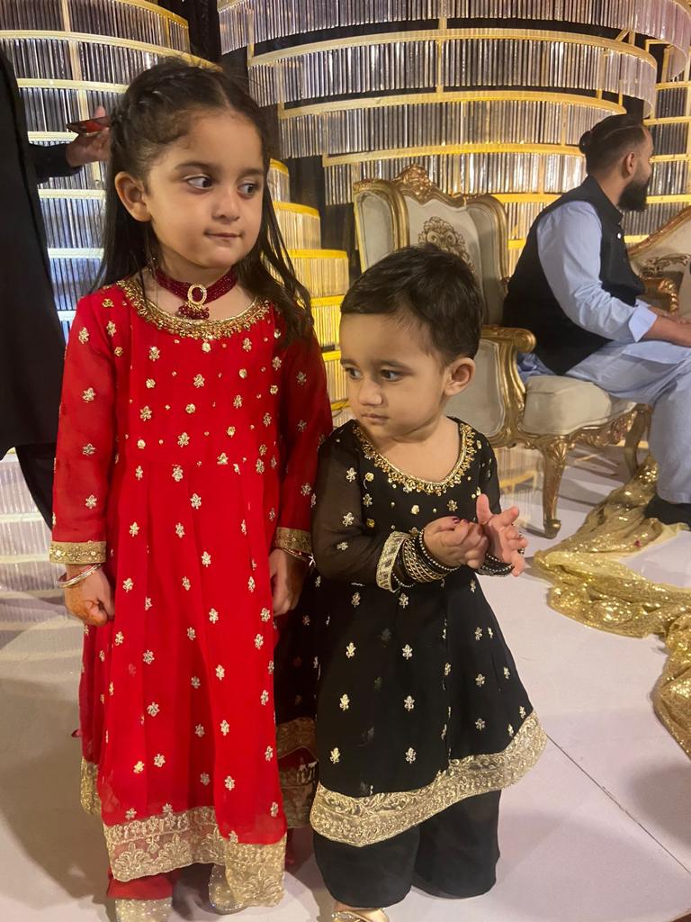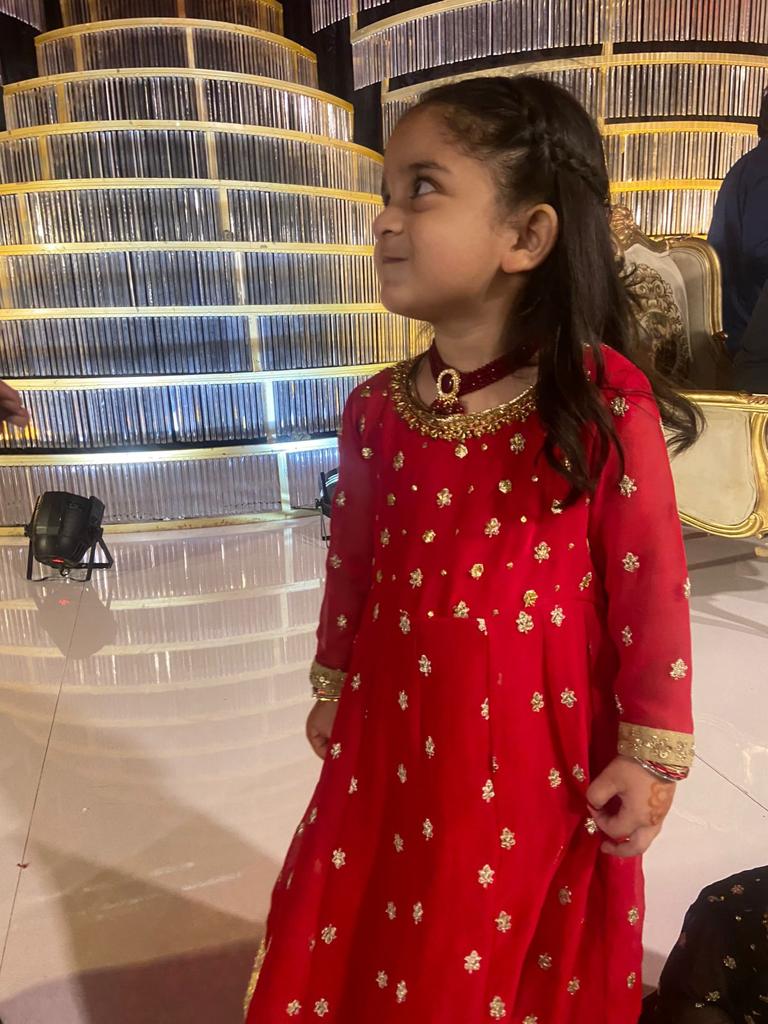 Our adorable clients look so pretty in Mahrani Jr. red variation kali peshwas in a voluminous chiffon fabric with zari tilla & gotta work. It has a completely handworked bodice with bead, pearls, gotta & crystal detailing. Finished off with embroidered borders at the hem and paired with dhaaka pajama, it is a great understated look for nighttime!